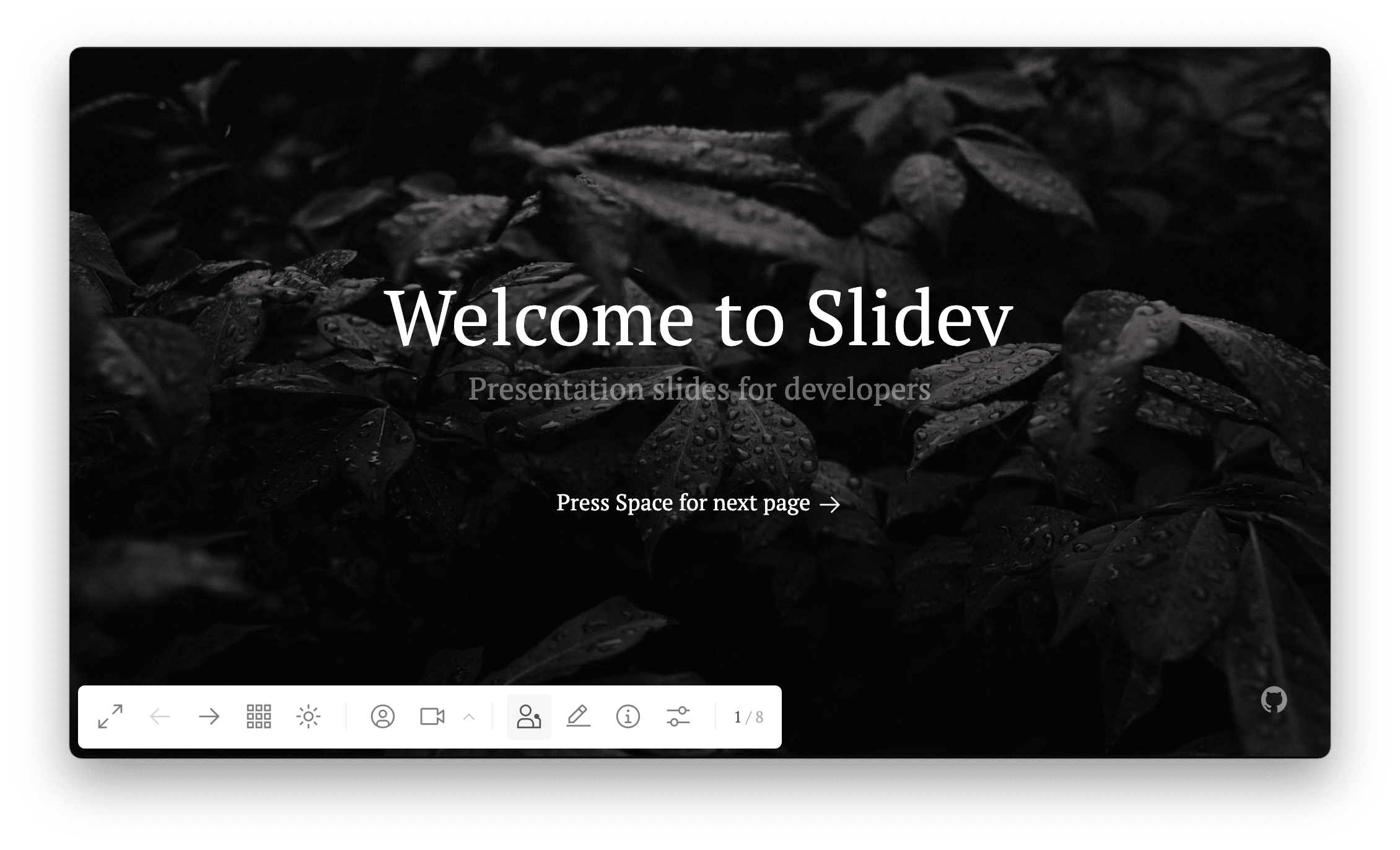 Переместите указатель мыши в левый нижний угол страницы Slidev, и у вас появится панель навигации.