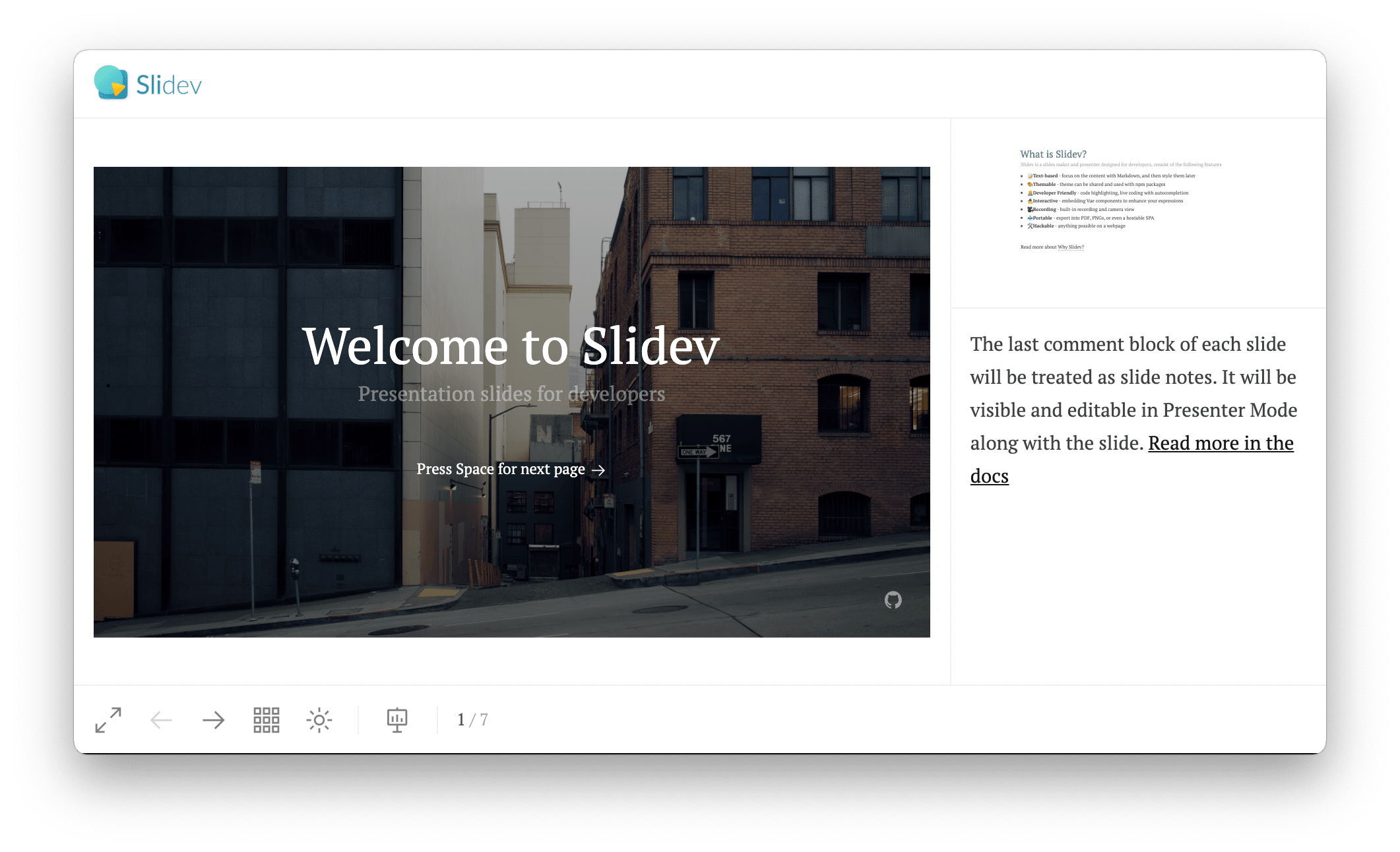 Нажмите на кнопку на панели навигации или перейдите вручную на http://localhost:3030/presenter, чтобы войти в режим докладчика. Каждый раз, когда вы входите в режим докладчика, другие экземпляры страницы будут автоматически синхронизироваться с докладчиком.